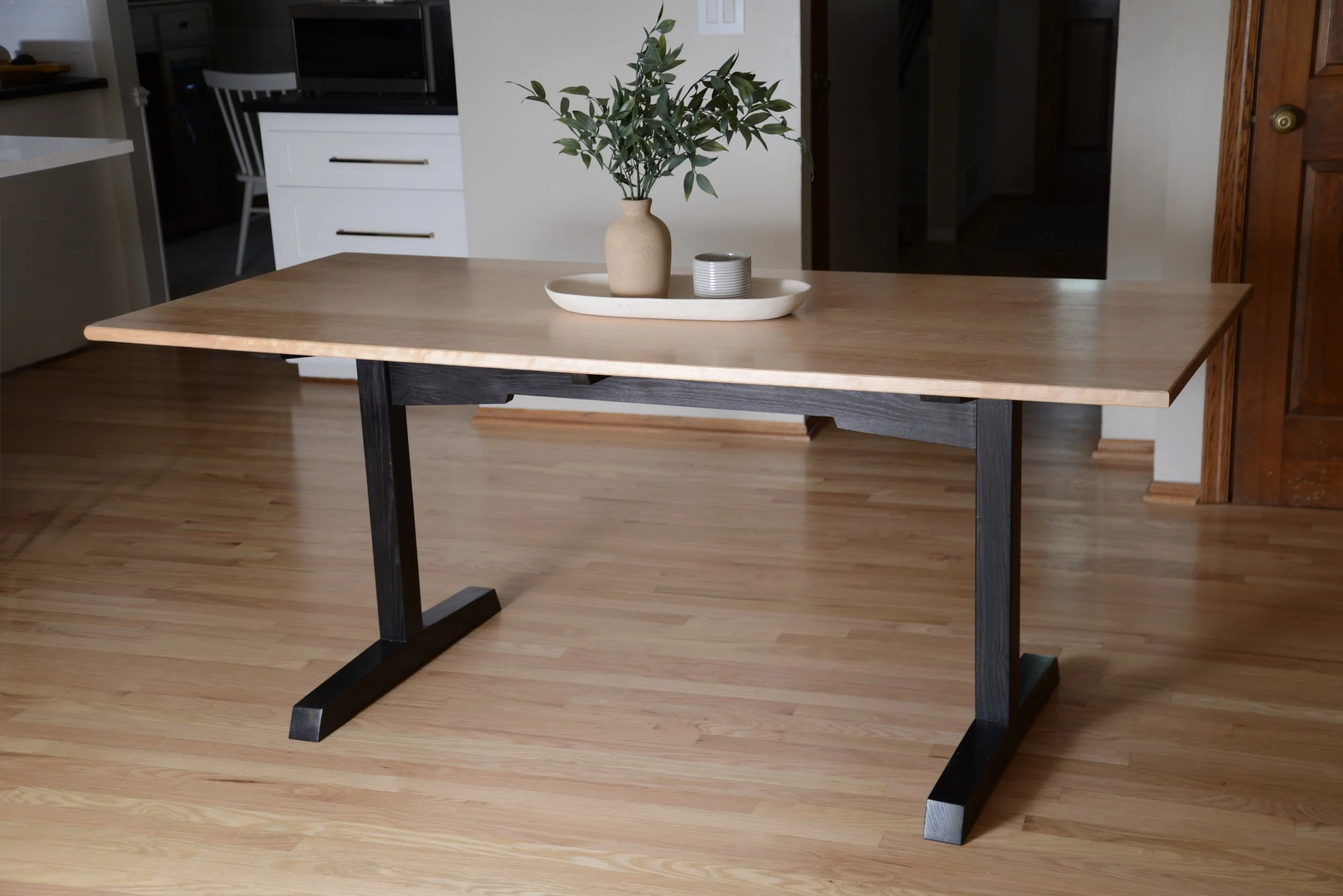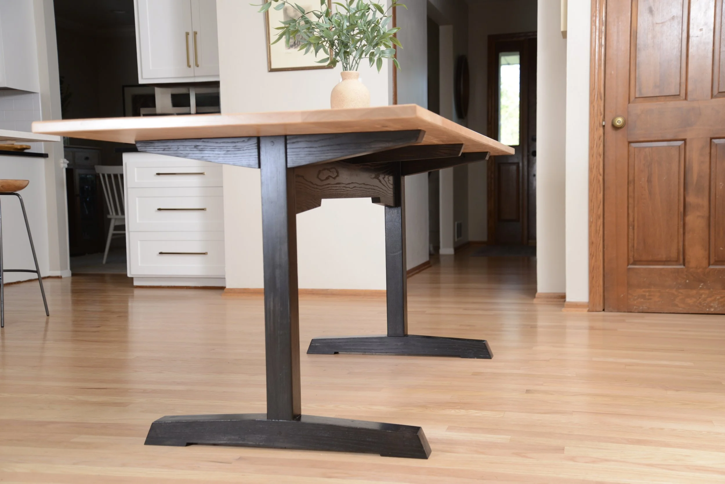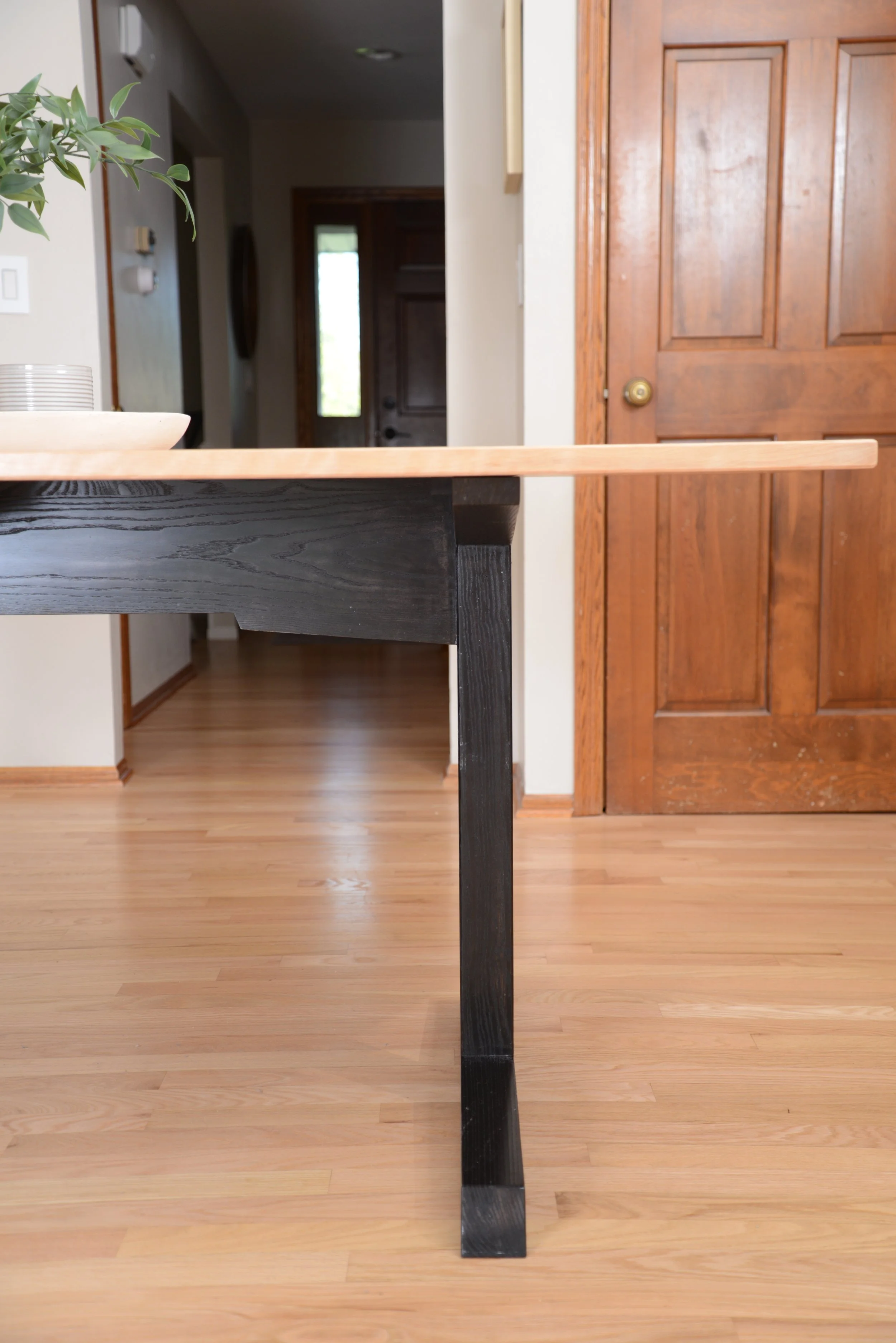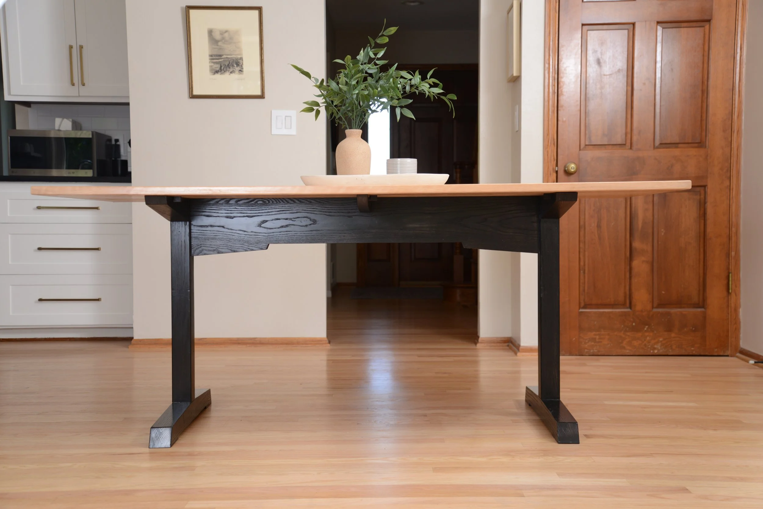 This trestle table with a beech top and an ebonized ash base solves one big problem with most trestle tables - where to put your legs! By tucking the trestle up towards the top you there is nothing to hit your knees or feet on. It also makes the table incredible sturdy while allowing it to remain incredibly light. This table is built to last generations featuring drawboarded mortise and tenon joints, wedged mortises, and half laps. Comfortable seating for 6 that can be stretched to 8 by adding seating to the ends.