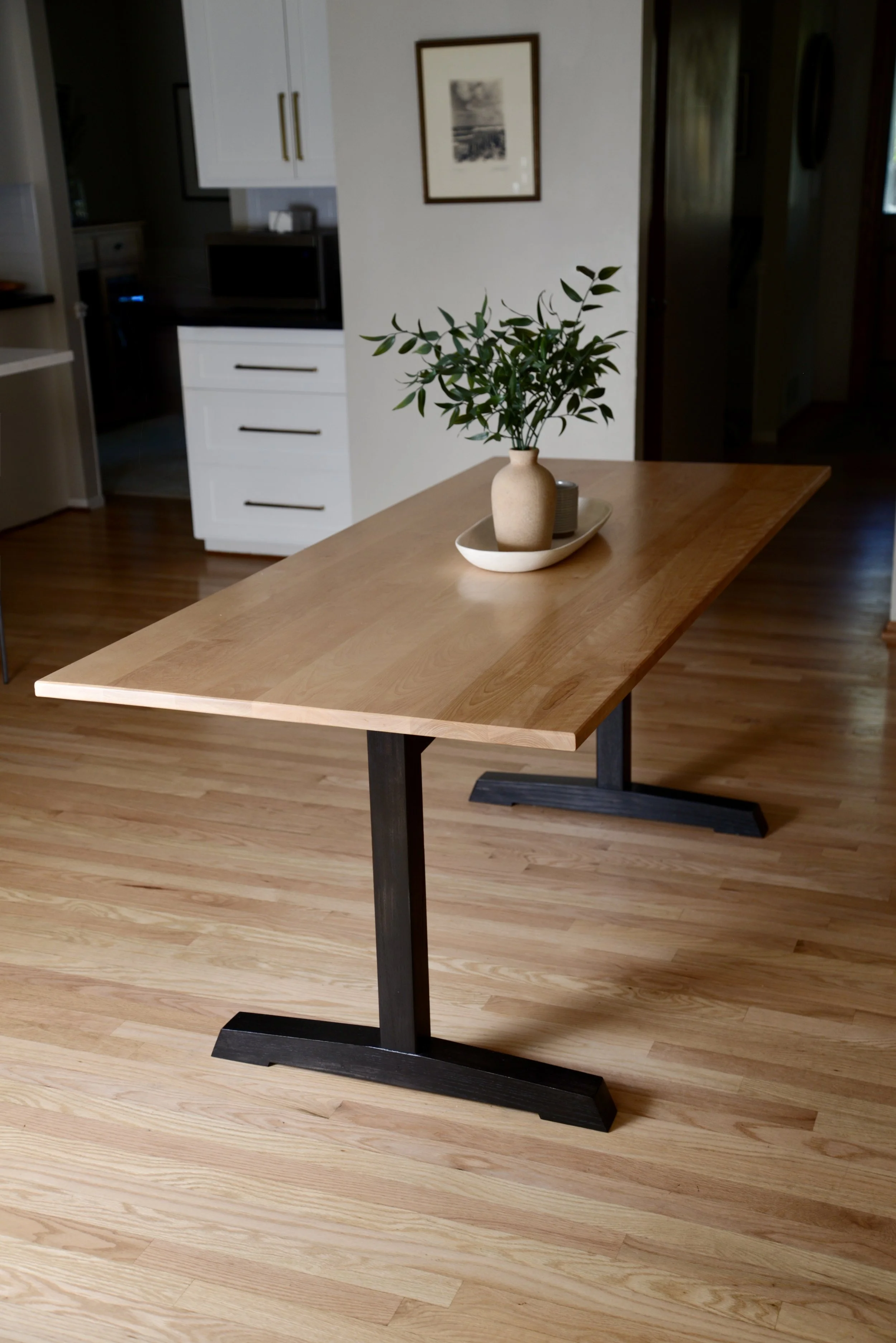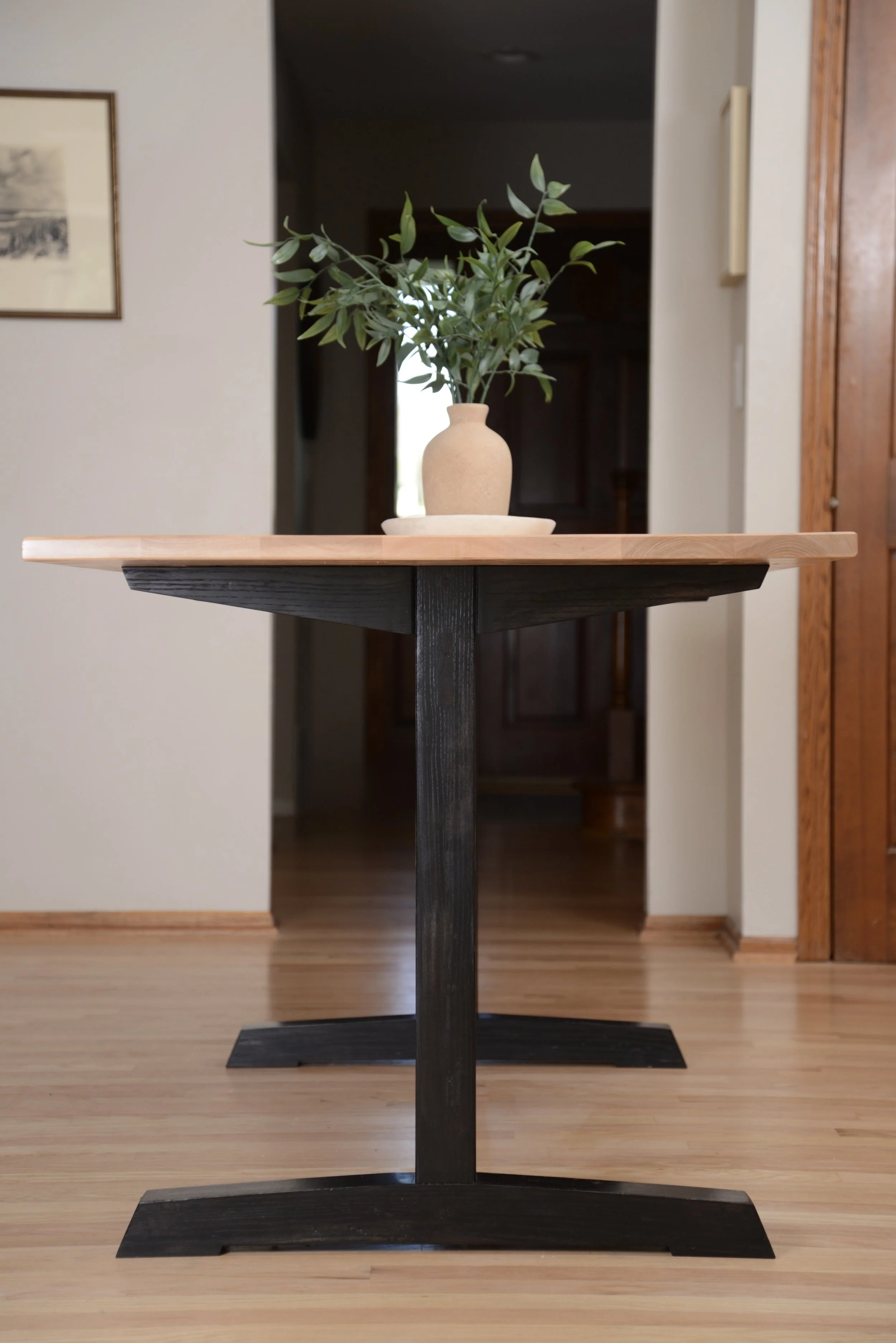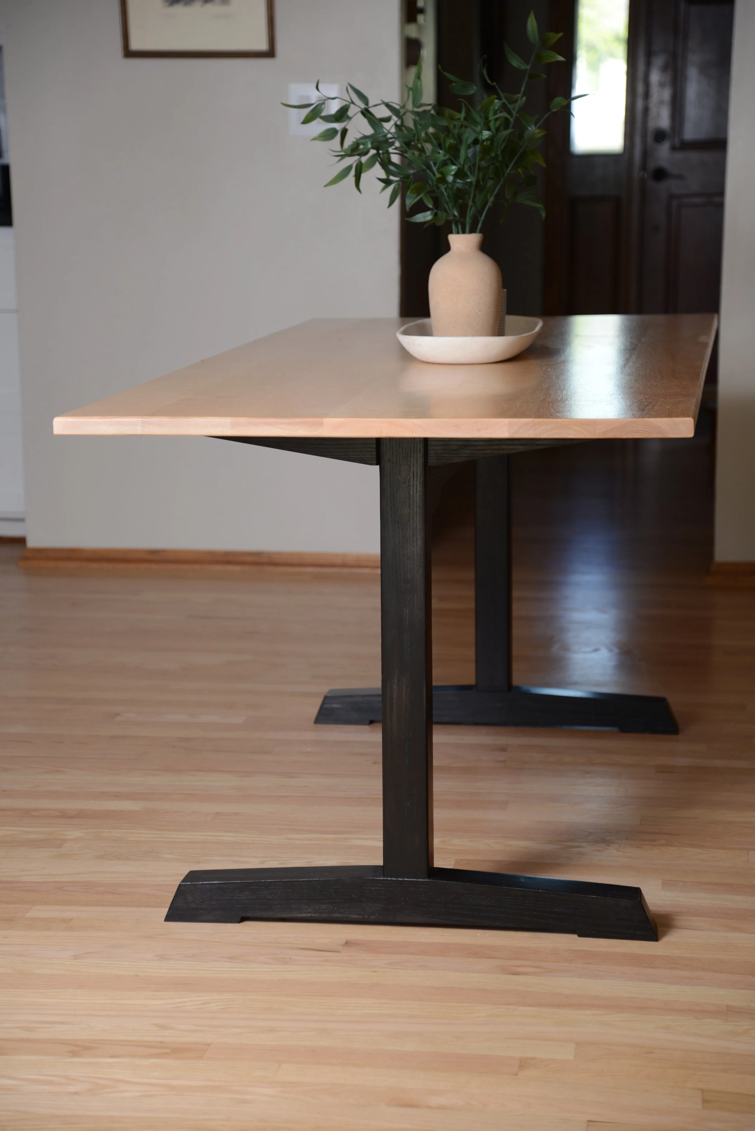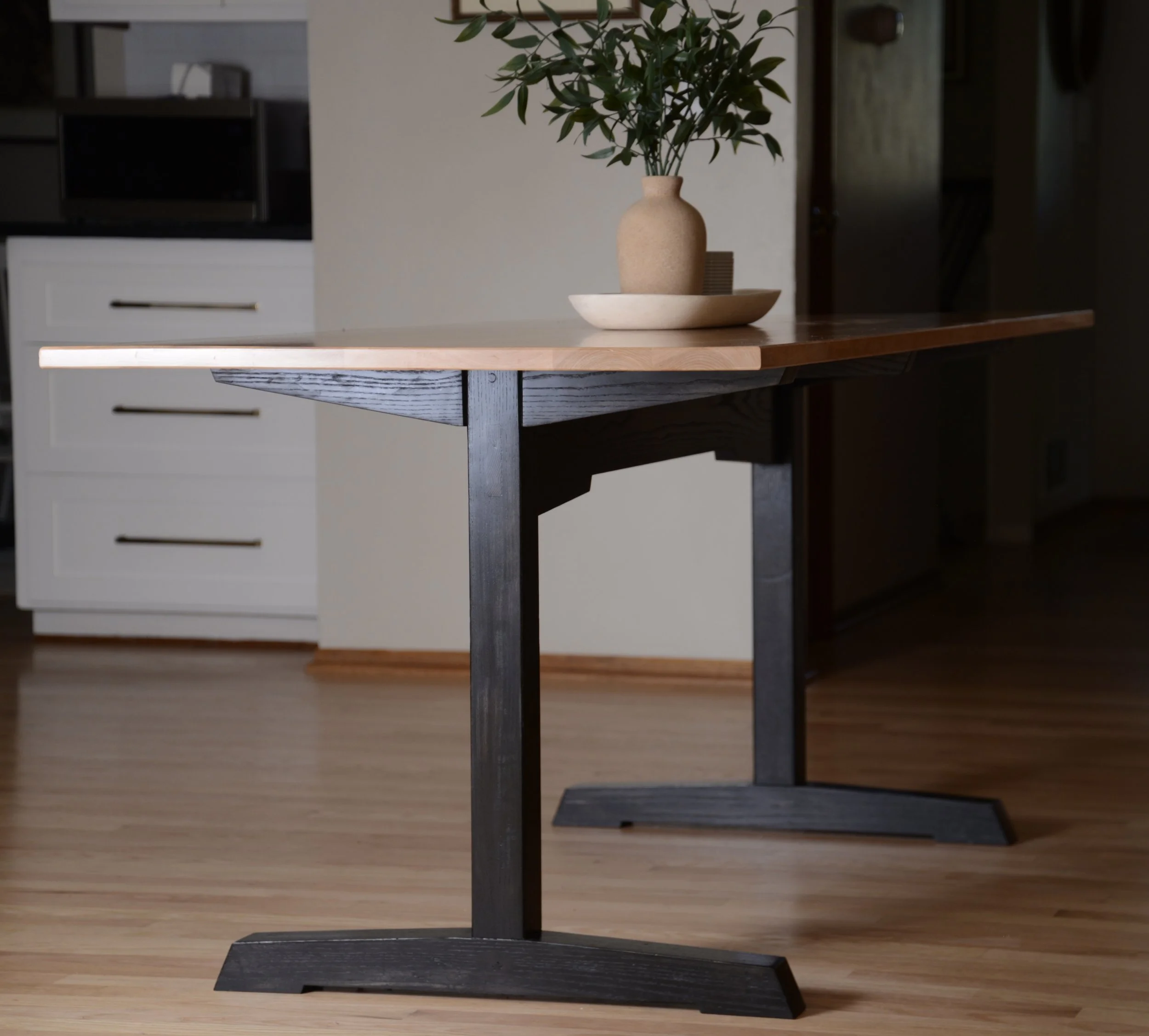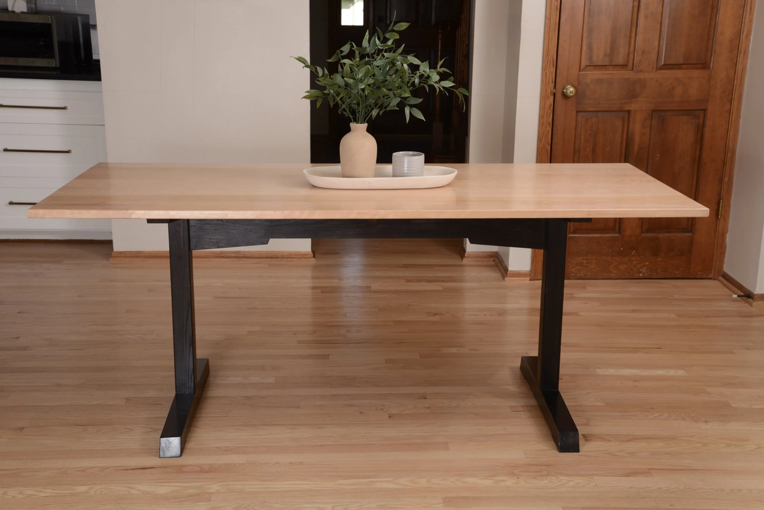 This trestle table with a beech top and an ebonized ash base solves one big problem with most trestle tables - where to put your legs! By tucking the trestle up towards the top you there is nothing to hit your knees or feet on. It also makes the table incredible sturdy while allowing it to remain incredibly light. This table is built to last generations featuring drawboarded mortise and tenon joints, wedged mortises, and half laps. Comfortable seating for 6 that can be stretched to 8 by adding seating to the ends.