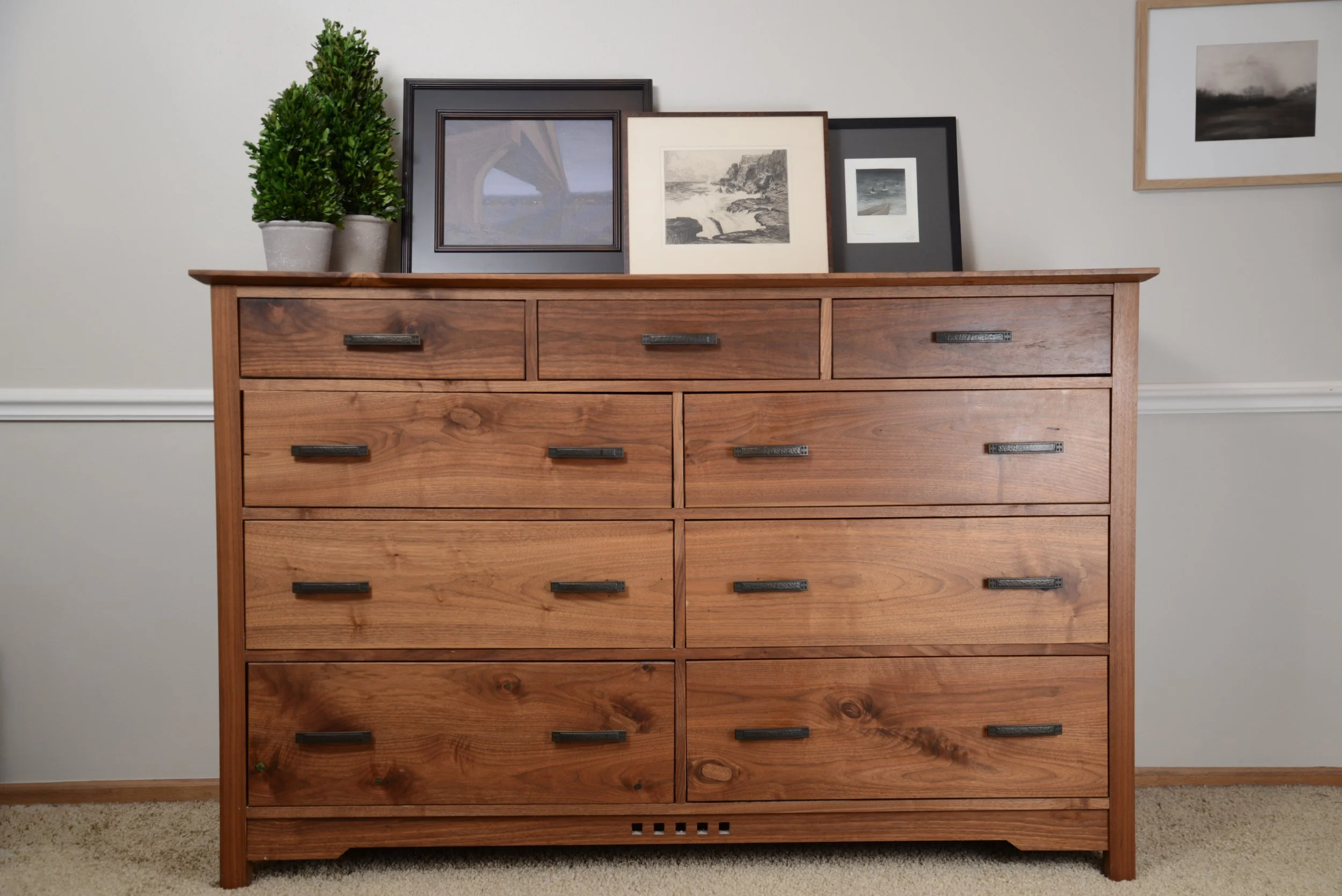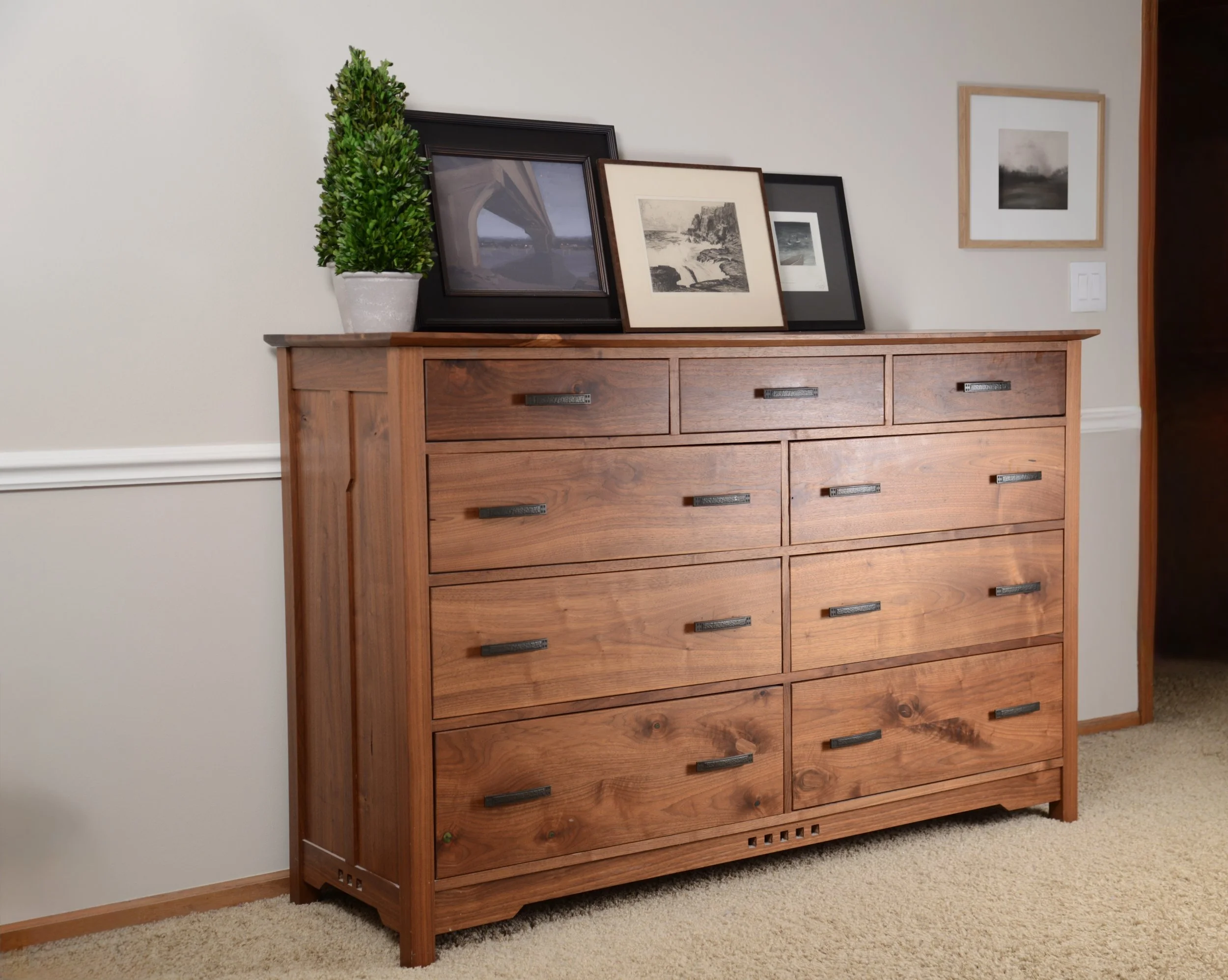 A large dresser designed for maximum storage. Solid mortise and tenon construction means this dresser is built to last. It features a knock-down design to allow it to fit through most doors and stairways. Crafted in solid walnut with a natural finish. Features unique design features in the lower stretchers with a lift motif and square holes, as well as a shield motif on the end styles. Grain runs continuously across the drawerfronts while the end panels are bookmatched which elevate the piece beyond the ordinary.