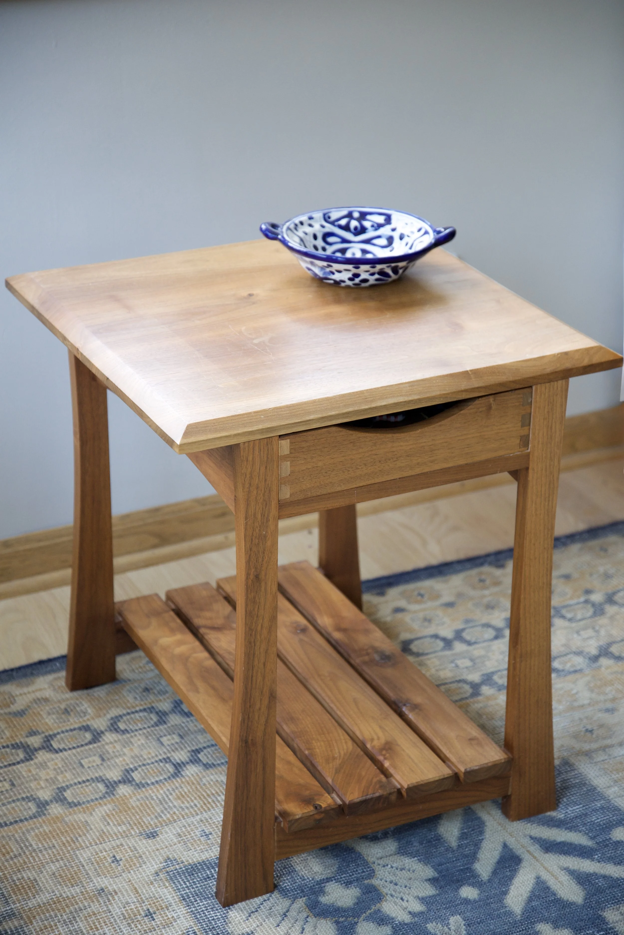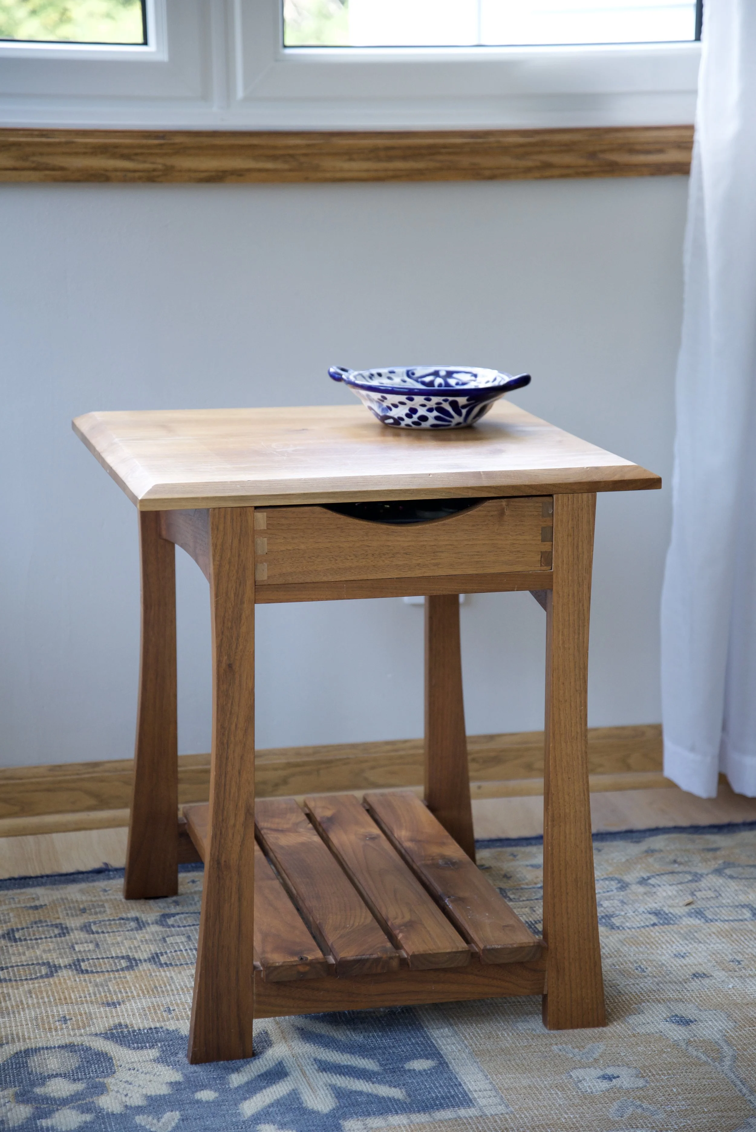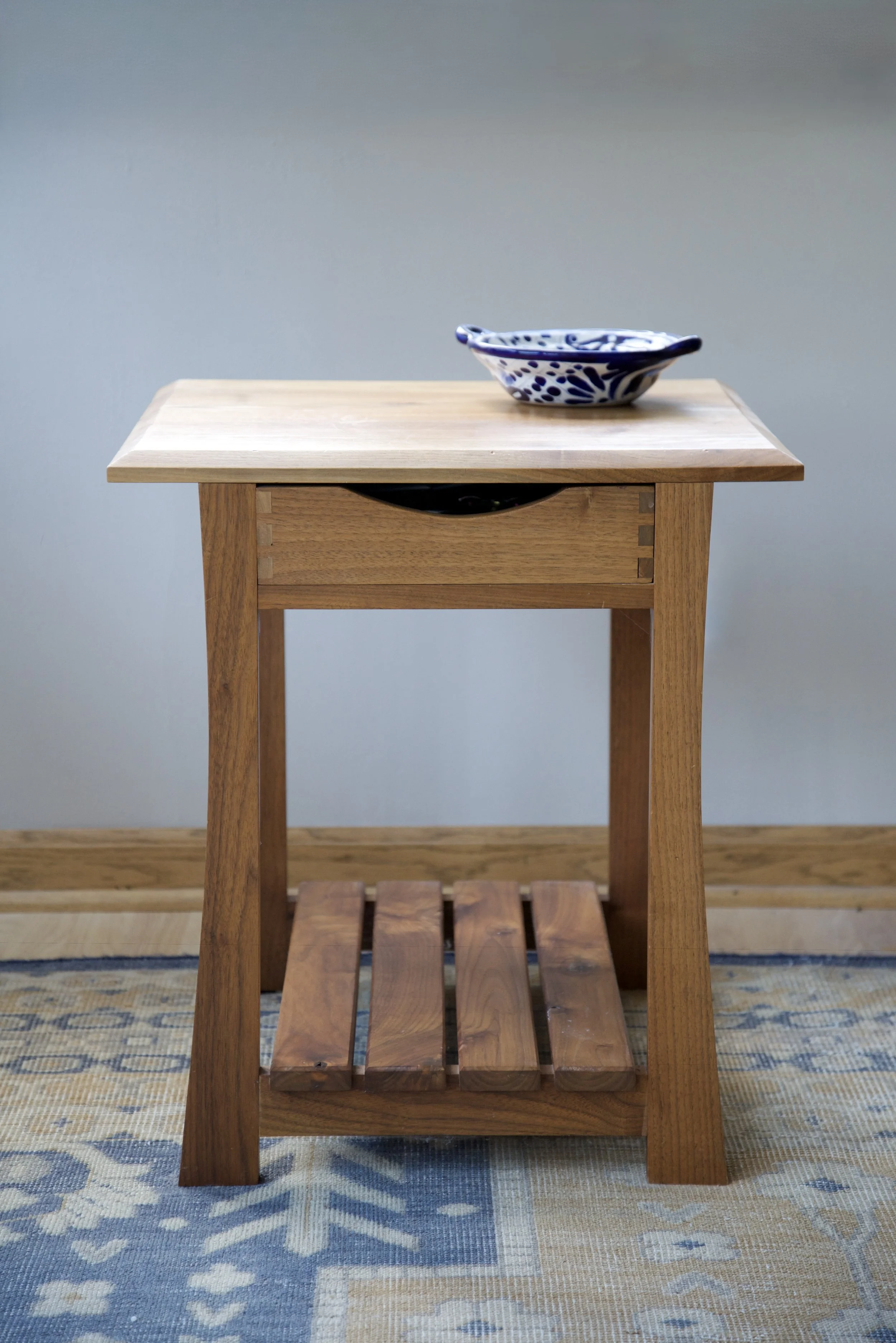 Walnut Side Table This side table is constructed with solid walnut. It features a drawer with through dovetails that can be opened from either side, beautiful curves, and a slatted shelf.